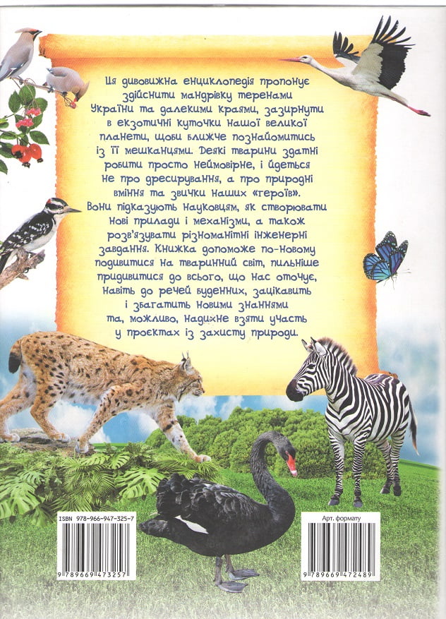 Ця книга напевно змусить кожного пильніше придивитися до всього, що нас оточує, навіть до речей буденних і звичних, зацікавить і збагатить новими знаннями, спонукає до конкретних дій — любити, цінувати й берегти природу, вивчати і примножувати її багатства. Завдяки нашій енциклопедії ви зможете здійснити своєрідну мандрівку українськими лісами, степами, горами, прісними водоймами і морями — Чорним та Азовським. Там усюди живуть дивовижні, сумирні й грізні, а часом кумедні звірі та птахи, риби, плазуни й комахи.