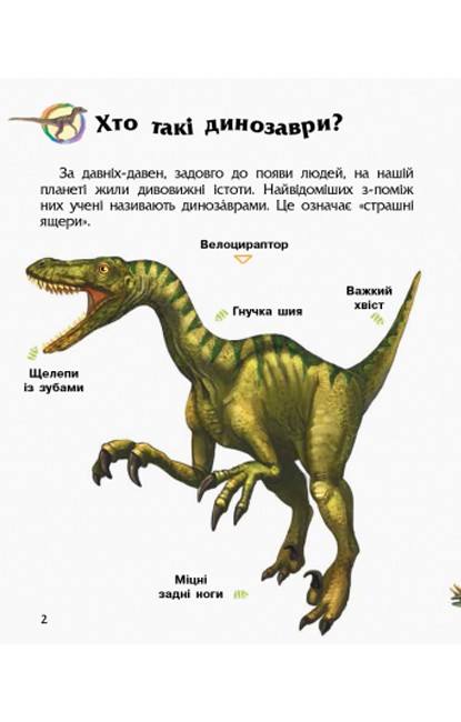 Книга допоможе допитливій малечі отримати загальне уявлення про давніх тварин, вивчити нові слова, дізнатися багато цікавого про доісторичний світ.