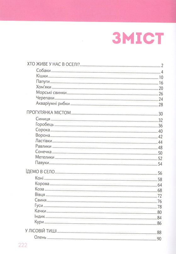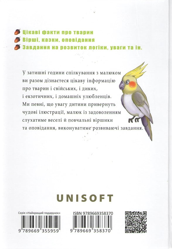 У затишні години спілкування з малюком ви разом дізнаєтеся цікаву інформацію про тварин і свійських, і диких, екзотичних, і домашніх улюбленців. Ми певні, що увагу дитини привернуть чудові ілюстрації, малюк із задоволенням слухатиме веселі й повчальні віршики та оповідання, виконуватиме розвиваючі завдання. Книга містить цікаві факти про тварин, вірші, казки, оповідання, завдання на розвиток логіки, уваги та ін.