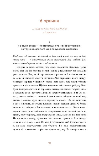 Усе це врахував німецький економіст Домінік Спенст. Він створив унікальний щоденник «6 хвилин», який допоможе вам не відкладати зміни на потім. Витрачаючи лише 3 хвилини вранці й 3 хвилини увечері, ви зможете сформувати корисні звички, які допоможуть зробити ваше життя більш усвідомленим, гармонійним і щасливим. Перевірені на практиці методи не дозволять вам припинити роботу над собою, а відтак ви зможете завершити розпочату трансформацію.