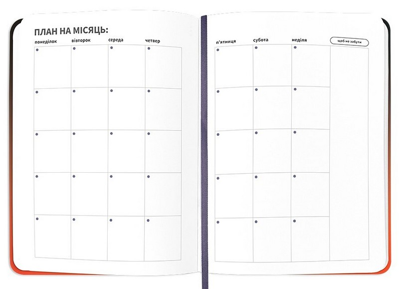 Всередині ви знайдете: 5 щотижневих розгортів на місяць, щомісячний трекер звичок, трекер витрат, цілі на рік і плани на місяць, чеклісти, дошку бажань, колесо балансу, списки улюблених книг, фільмів, подкастів та курсів, сторінку щастя і навіть місце для підбиття підсумків року. Та ще багато чого цікавого.