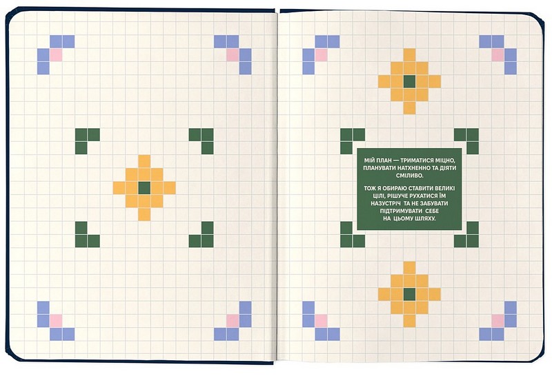 • Додаткові розвороти: план цілей на рік, дошка бажань, мотивуючий лист собі, колесо балансу, списки фільмів та книг, трекери звичок, важливі питання собі, сторінки в крапку для нотаток, маленькі і великі перемоги року, лист-подяка собі