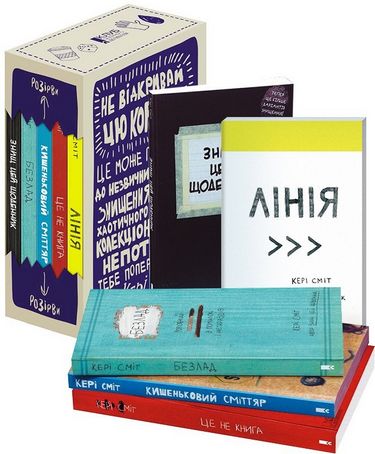 Знудьгувалися за креативним та оригінальним? Шукаєте натхнення для створення чогось нереального та крутого? Чи просто хочете розвантажити мозок і відпочити? Книжки канадської письменниці та художниці Кері Сміт — це must have для кожного, хто шукає ідей та прагне їх створювати. Воркбуки, в яких можна креслити, залишати плями, видирати сторінки, виконувати різні завдання, іноді збирати мотлох, іноді цікаві думки, проводити лінії та малювати, записувати та залишати пусті сторінки — тут можна все. Ціла коробка для натхнення і творчості!