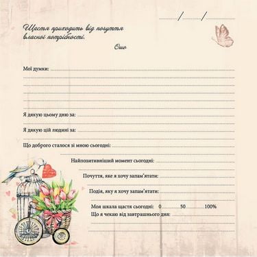 Особистий щоденник знадобиться щоб занотувати плани на майбутнє, свої мрії, записати спогади яскравих подій... Наш Щоденник щастя» ніжний та стильний, з романтичними вінтажними ілюстраціями та висловлюваннями великих мудреців, що можуть стати дороговказом на шляху до обранної мети.