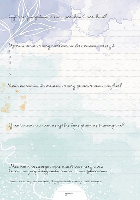 Щоденник “Де ховається радість” – це ваш потаємний друг. Він нагадає вам про маленькі радості життя, про важливість дякувати собі і світу, про те, що кожного дня у нас є хоча б один привід посміхнутися.
