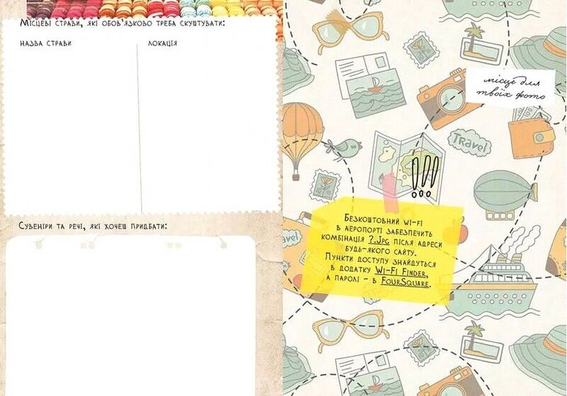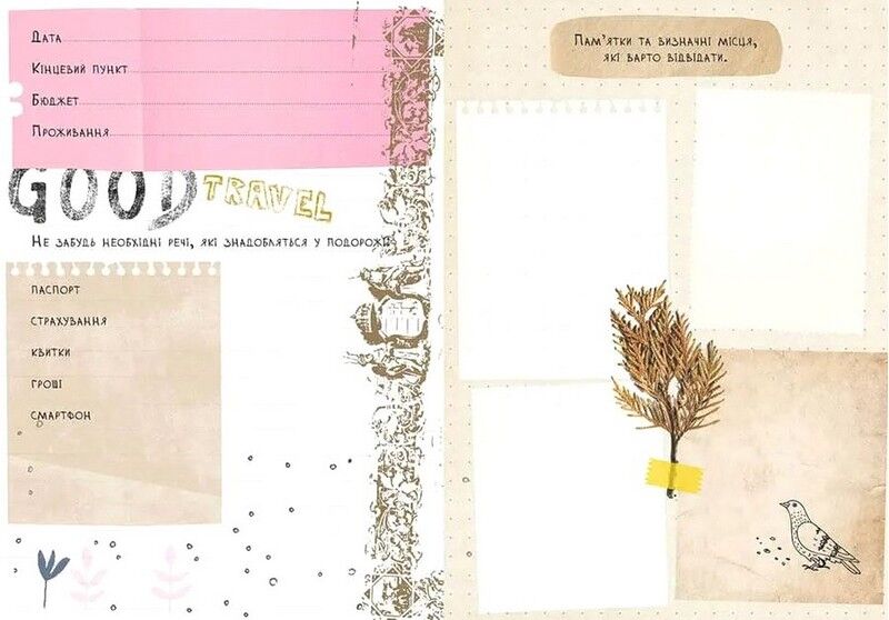 На сторінках блокнота ви знайдете цікаві лайфхаки для подорожей, карти маршрутів, чек-листи мандрівника, блоки, які можна заповнювати своїми планами, а згодом враженнями, фото і гарними знахідками.