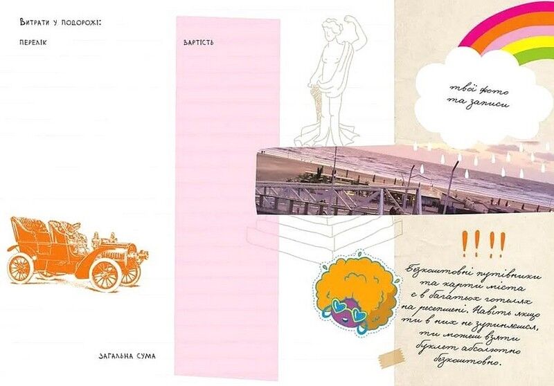 На сторінках блокнота ви знайдете цікаві лайфхаки для подорожей, карти маршрутів, чек-листи мандрівника, блоки, які можна заповнювати своїми планами, а згодом враженнями, фото і гарними знахідками.