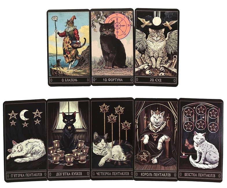 Карти «Таро» — це набір карт для тих, хто хоче краще відчути себе, прислухатися до інтуїції та заглянути глибше у щоденні питання. У цій колоді – образи котів, які поєднують мудрість, спокій і трохи магії. Кожна карта має власне послання, що допоможе побачити ситуацію під іншим кутом або знайти новий життєвий напрямок.