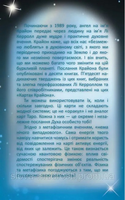 Карти Крайона створювалися як інструмент, мета якого – духовно підтримувати вас щодня. Це важлива частина роботи "команди Крайона" , оскільки прояв нової, кращої реальності Землі починається з кожного. Детальніше: https://slova-mudrosti.prom.ua/ua/p2269489531-karty-krajona-kart.html