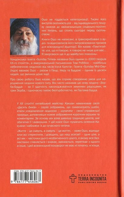 «Захід є Захід, а Схід є Схід, і їм не зійтися разом», – писав у відомій баладі Редьярд Кіплінг. «Життя є життя, а смерть є смерть», – кажемо ми. «Життя – це смерть, а смерть – це життя», - каже Ошо, відкидаючи всі стереотипи, і доводить, що наш всесвіт – одне ціле, а всі ми – часточки цього незбагненного цілого, в якому все безнастанно з’являється і зникає, змінюється, перетікає з одного в інше, і цей вселенський коловорот не має ні початку, ні кінця.