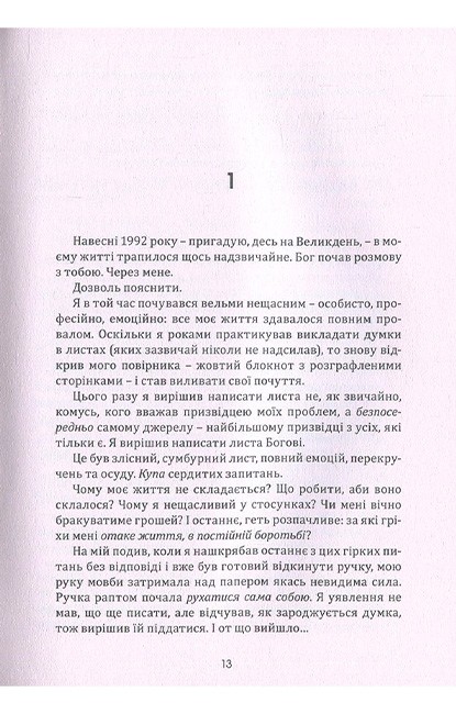 «Розмови з Богом. Незвичайний діалог. Книга 1» — це щира розмова між людиною й Богом, яка починається з болю, розчарування і запитань без відповідей. Автор — Ніл Дональд Волш — пише в стані глибокої життєвої кризи, та несподівано отримує… відповідь. Відповіді цієї книги — глибокі, прості, наповнені співчуттям. Тут немає релігійного тиску чи моралізаторства — лише любов, прийняття й чесність. Це книга не про Бога як фігуру, а про стосунок, про сміливість запитувати й відкритість почути.