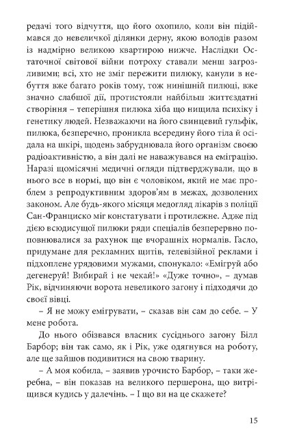 Людство ледве пережило ядерну війну. Тварини — розкіш. Співчуття — головна людська якість. А хто ми без нього? У цьому світі живе Рік Декард — мисливець на андроїдів, яких не відрізнити від людей. Його завдання — «виводити з ладу» тих, хто втік на Землю. Але що, якщо андроїди починають мріяти? «Чи мріють андроїди про електричних овець?» — не просто фантастика. Це філософія під виглядом трилера, література з великим серцем і складними питаннями, які не мають однозначної відповіді.