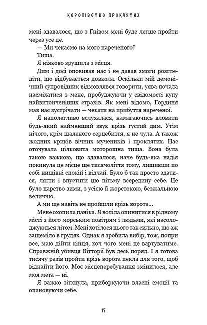 Продовження історії Емілії переносить читача у самісіньке серце Пекла, до палаців Принців Гріхів, де влада — гра, а кохання — пастка. Гнів більше не просто демон — він ключ до правди, яку Емілія шукає, навіть якщо вона її знищить. «Королівство Проклятих» — це роман про пристрасть, магію та внутрішню боротьбу. Атмосфера стає ще густішою, вибори — складнішими, а ставки — фатальними. І ти або піддаєшся темряві, або приборкуєш її.