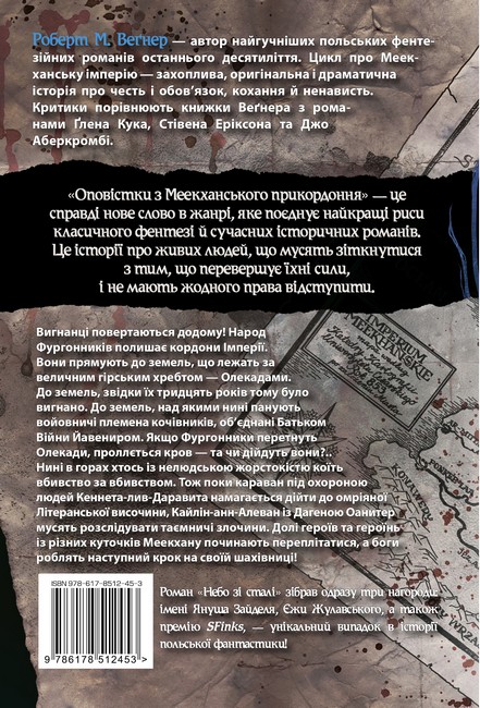Третя книга циклу переносить нас у нові випробування Меекханської імперії. "Небо зі сталі" — це історія про залізо війни, про криваві битви і про людські серця, які залишаються вірними навіть тоді, коли світ навколо валиться. Тут сходяться армії й легенди, магія й холодна логіка, а герої роблять вибір, що змінює цілі епохи.