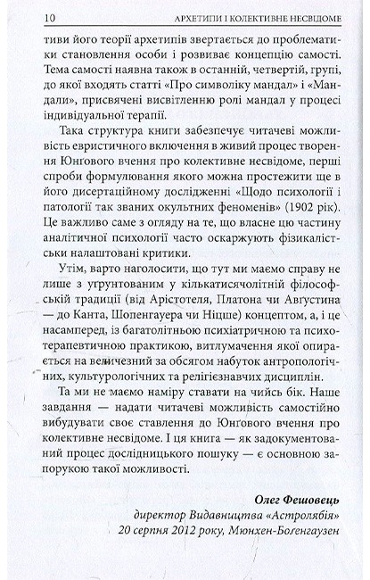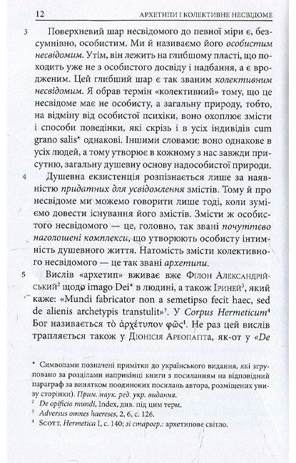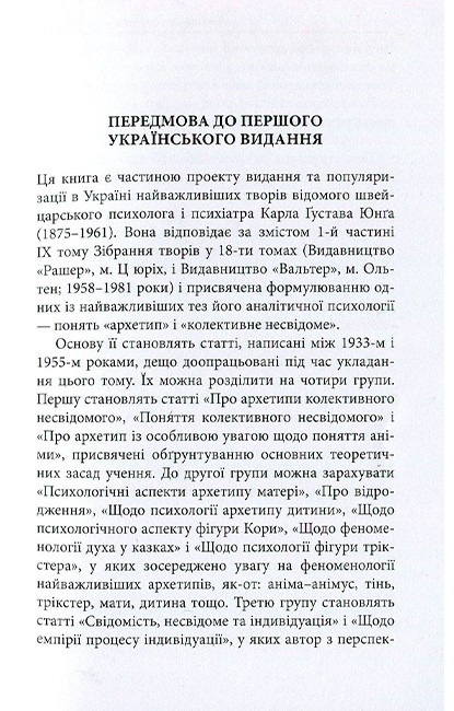 Книгу Карла Ґустава Юнґа «Архетипи і колективне несвідоме» становлять опубліковані протягом 1933–1955 років статті, у яких автор розвиває одні з найважливіших елементів його аналітичної теорії. Перед нами виклад учення про колективний рівень несвідомої частини нашої психіки і про архетипи як вроджені універсальні структури, що становлять зміст цього колективного несвідомого. Образний паралелізм, властивий різноманітним міфологіям, релігіям, мистецтвам, казкам, філософським, алхімічним і науковим ученням, а також нашим снам, фантазіям та маренням, допомагає авторові виявити й описати ці архетипи, а також дослідити їхній вплив на становлення особи. Книга торкається практично всіх аспектів людської життєдіяльності, а тому буде цікава не лише психологам та психотерапевтам, а й філософам, релігієзнавцям, антропологам, мистецтвознавцям, а також усім, хто прагне збагнути часто приховані від ока основи нашого існування.