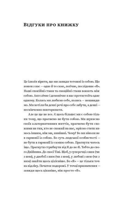 Про природу людської подвійності, дублювання й множинності й розмірковує Тарас Лютий у своїй книжці. Автор зацікавився цією темою понад двадцять років тому, а останнім часом нотував свої міркування в окремих есеях. Нарешті всі дослідження й розвідки з теми двійництва зібрані в одній книжці.