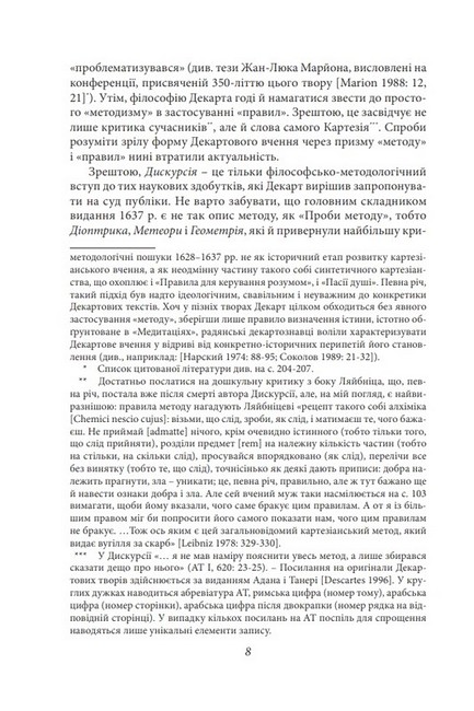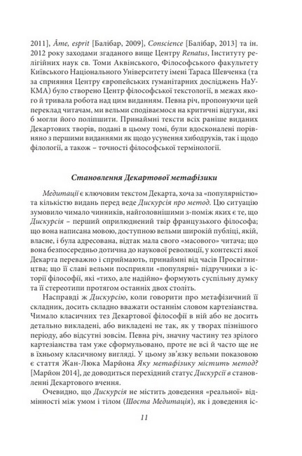Рене Декарт (1596–1650), видатний французький філософ, відомий передовсім як творець першої метафізики Нового часу, мислитель, що визначив поле дискусій новочасної філософії в цілому. «Дискурсія про метод» і «Медитації про першу філософію» є ключовими текстами цієї метафізики. Це видання вперше подає українські переклади зазначених творів під однією обкладинкою.