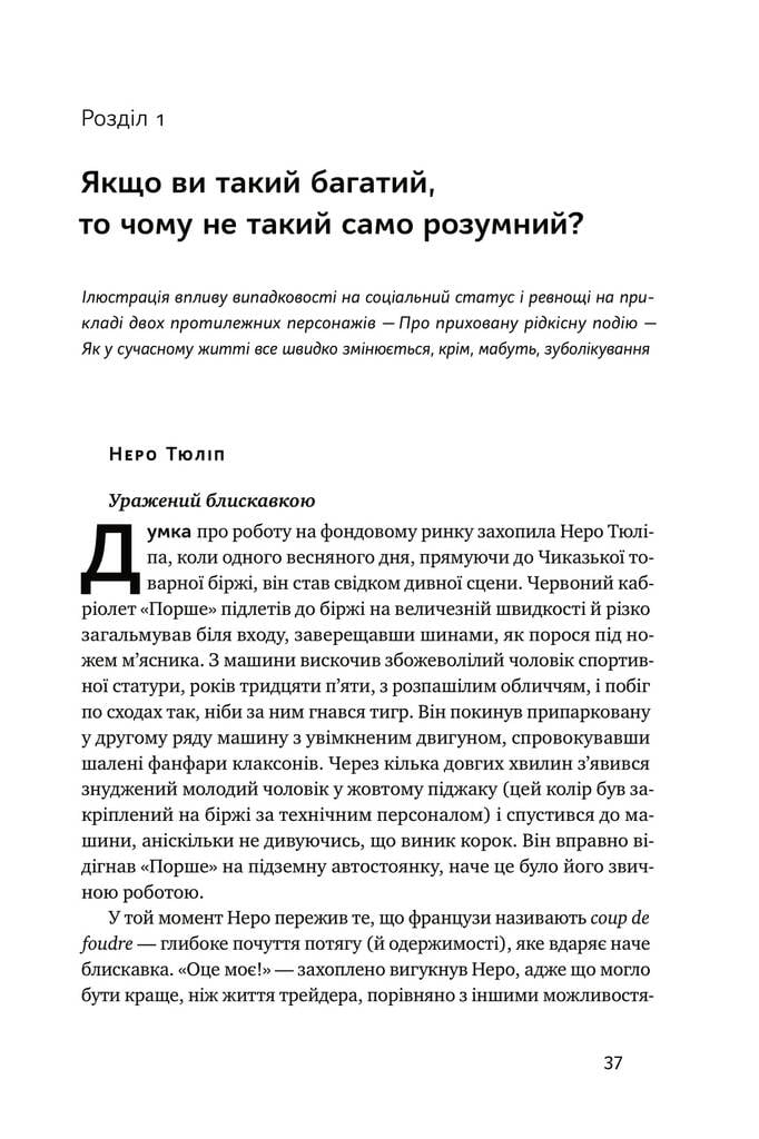 Пам’ятаєте анекдот про чоловіка, який щодня молився про виграш у лотереї, але так і не купував білет? З нього ми засвоїли головний урок: без дії не буде результату. Але цей висновок доречний не завжди. Дія бажаний результат. Купити білет виграти в лотерею. Старанно вчитися скласти іспит на відмінно. Бути наполегливим трудоголіком стати мільйонером. Докладання зусиль уможливлює варіант, а не робить його неминучим. Виграш чи програш — це вже як пощастить. До такої думки схиляє Насім Талеб, який присвятив книжку ролі випадковості в житті та бізнесі. Він називає удачу демократичною пані, яка усміхається всім незалежно від віку, статі чи соціального статусу. Вона втручається і змінює життя тоді, коли об’єктивні причини не приводять до бажаного наслідку. Коли традиційна бізнес-література не допомагає. Коли ділове мислення не рятує.