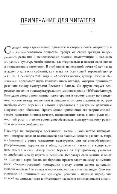 Автор книги в своей психотерапевтической практике, в общении с коллегами и в ходе обучения психотерапевтов уже в течение длительного времени сталкивается с феноменом, который до сих пор не принимался во внимание или рассматривался только поверхностно в психотерапии: пациенты врачей-психотерапевтов значительно чаще, чем раньше, страдают синдромом, который можно на¬звать потерей смысла жизни или недостаточным пониманием смысла жизни. Этот синдром может скрываться за любыми душевными и физическими недугами, он распознается, обычно, только после приложения психотерапевтом определенных усилий. В соответствии с принципами позитивной психотерапии пациенты ищут смысл своей жизни, который они до сих пор не смогли найти, и их проблемы и конфликты являются выражением этого поиска. Автор исследует феномен с различных точек зрения: клинической и исторической, индивидуально-психологической и транскультуральной, религиозной и научной. Он подробно рассматривает ответы, найденные и предложенные различными религиями, а также вспомогательные методы, предлагаемые различными психотерапевтическими школами в теории и на практике. Большое место занимают в книге вопросы религии и веры, которые собственно находятся в центре поисков людьми смысла жизни. При этом автор очень впечатляюще говорит о себе и своих религиозных убеждениях, хорошо зная, что о религии можно адекватно рассуждать только тогда, когда сам являешься ее носителем. Однако Носсрат Пезешкиан не стремится обратить читателей в свою веру, целью его исследования является показ направлений поиска и побуждение к этому читателей. Смысл своей жизни каждый должен найти сам.