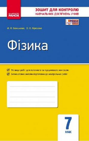 Зошит відповідає вимогам нової програми з фізики для 7 класу загальноосвітніх навчальних закладів та призначений для поточного і тематичного контролю навчальних досягнень учнів з фізики. Посібник складається з двох частин: поточний контроль знань і контрольні роботи. У першій частині посібника запропоновано декілька видів перевірочних робіт: контроль теоретичних знань – перевіряється рівень засвоєння теоретичного матеріалу; самостійна робота – відстежується рівень засвоєння отриманих теоретичних знань, уміння розв’язувати якісні й розрахункові задачі на одиндва логічні кроки; практичний тренінг – контролюються вміння застосовувати отримані знання під час розв’язування задач різного типу, володіння навичками читати й аналізувати матеріал, поданий графічно, виконувати пояснювальні рисунки. Кожну роботу подано у двох варіантах. Друга частина посібника містить контрольні роботи, які подані у трьох варіантах і за допомогою яких перевіряється рівень засвоєння учнями навчального матеріалу за кожною темою. Продумана структура навчального матеріалу, диференціація завдань за рівнем складності забезпечують оперативність під час використання посібника. На сайті interactiv.ranok.com.ua учні можуть в онлайнрежимі підготуватися до контрольних робіт, наведених у посібнику: виконати аналогічні завдання, здійснити самоконтроль, ознайомитись із розв’язанням завдань. Учитель може ознайомитися з результатами, отриманими учнями. Зміст завдань дозволяє використовувати посібник у комплекті з будьяким чинним підручником фізики для 7 класу. Призначено для учнів 7 класу загальноосвітніх навчальних закладів і вчителів фізики.