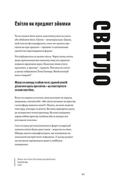 Сьогодні фотографія стає все більш популярною. Це пов’язано зі стрімким розвитком і розповсюдженням камер і смартфонів. “Як знімати неймовірні фотографії” ідеально пасує тим, хто хоче відійти від аматорства і почати фотографувати професійно. Проте ви не знайдете тут складних графіків, діаграм чи сухих професійних термінів. Замість цього автор надихне вас роботами культових фотографів, доповнивши їх власним аналізом із практичними порадами та гумором.Книга охоплює п’ять важливих тем: композиція, експозиція, світло, об’єктиви та мистецтво бачення. На прикладі шедеврів від Анрі Картьє-Брессона, Себастьяна Сальґаду, Фея Ґодвіна, Надава Кандера, Доротеї Ланж та інших читачі побачать, як вдало застосовувати фотографічні прийоми, а також знайдуть натхнення для власних ідей.Для багатьох фотографія є чудовим та доступним способом творчо проявити себе. Тож ця книга може стати якісним путівником до створення неймовірних світлин із використанням професійних технік.На обкладинці використано світлину одного з найвідоміших арт-фотографів України Дмитра Богачука!