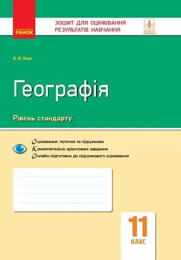 Посібник містить завдання для поточного та тематичного оцінювання результатів навчання учнів 11 класів із курсу «Географія». Видання також надає можливість онлайн-тестування. Видання призначене для учнів закладів загальної середньої освіти та вчителів географії.