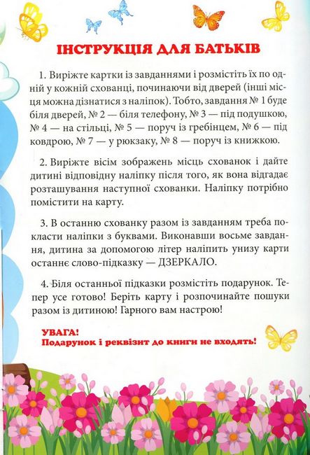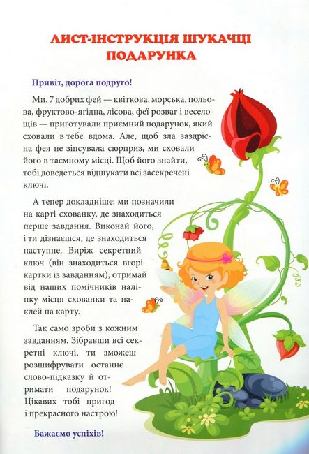 Чи пам’ятаєте, як у дитинстві ви мріяли про свята та подарунки і вірили, що всі мрії здійсняться? Згадали? Усміхнулися? Тож станьте для своєї дівчинки добрими чарівниками! Підготуйте подарунок і влаштуйте незабутню дівочу вечірку, сповнену цікавих пригод у пошуках приємного сюрпризу. Проведіть час весело і з користю — пройдіть квест разом із дитиною, розплутайте хитромудрі завдання і отримайте насолоду від спілкування з малечею. Подаруйте свято! Нехай лунає дитячий сміх та сяють щастям оченята!