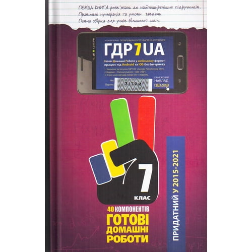 «УСІ ГДР. 7 клас» — універсальне видання для всіх шкіл України з українською мовою навчання. Книга забезпечує виконання • письмових домашніх робіт з алгебри, геометрії, фізики, хімії, української, англійської, російської та німецької мов, а також пропонує зразки творчих робіт з української та світової літератур і розвитку мовлення та подає в окремих блоках пояснення та теоретичні обґрунтування, на яких базуються розв'язків язання.