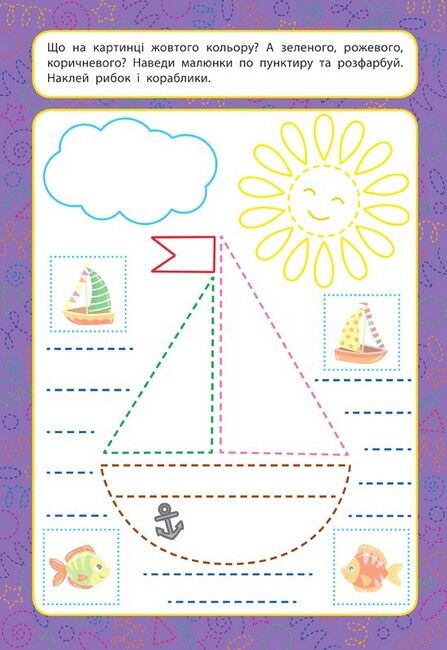 Це видання допоможе дитині запам’ятати назви кольорів. Виконуючи завдання, малюк потренується визначати колір предмета, наведе пунтирні лінії, розфарбує малюнки та попрацює з наліпками. Таким чином дитина підготує руку для майбутньої роботи з прописами для дошкільнят. Видання призначене для спільної роботи дітей віком від трьох років з батьками.