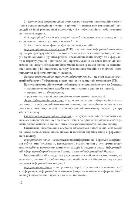 Навчальний посібник рекомендовано для викладання навчальних дисциплін “Інформаційна безпека держави та масова комунікація”, “Інформаційна безпека та медіааналіз” та “Організація кіберзахисту роботизованих систем розвідки”. Він містить теоретичні матеріали щодо сучасних технологій інформаційно-психологічного впливу в засобах масмедіа та принципи розпізнавання загроз маніпулювання свідомістю і захисту від них життєво важливих інтересів особи, суспільства, держави. Значна увага приділена спеціальним інформаційним операціям, акціям інформаційного впливу, інформаційним війнам і способам застосування інформаційній зброї для їх ведення.