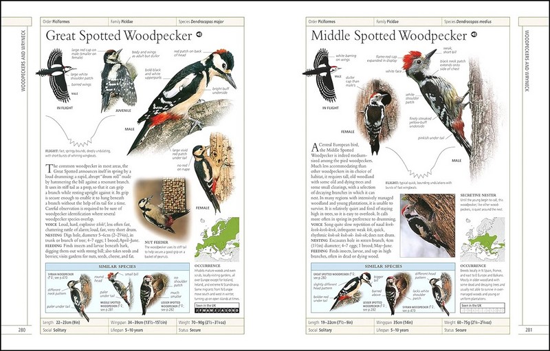 У каталозі видів 330 видів птахів, які найчастіше зустрічаються, описані на цілу сторінку. Побачте птахів у їхньому природному середовищі існування та дізнайтеся про характерну поведінку завдяки чудовим фотографіям, на яких зображені дорослі особини у типовому оперенні, самці, самки, молоді особини, а також літні та зимові варіації, які допоможуть вам швидко і легко ідентифікувати птахів. Кольорові карти підкреслюють осілі та мігруючі види птахів, щоб ви знали, на які види птахів очікувати, коли будете на природі. У цій книзі про птахів для дорослих ви знайдете ключові деталі та описи рідкісних видів і випадкових відвідувачів Британії та Європи.
