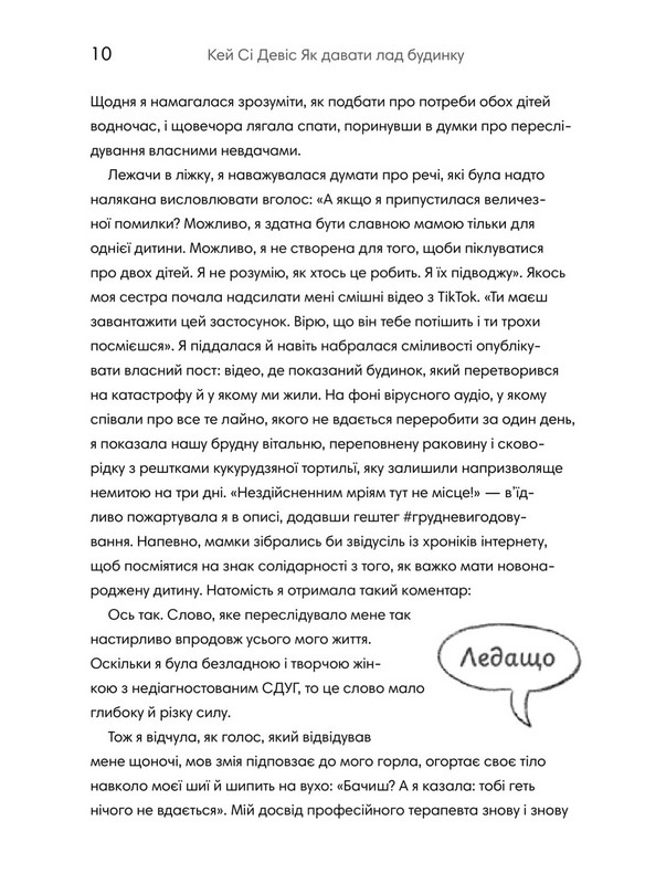 Кей Сі Девіс тривалий час жила з недіагностованим СДУГ. Вона мала труднощі з організацією порядку в домі. Сказати, що це її засмучувало, — не сказати нічого. Ситуація погіршилася з народженням другої донечки і настанням пандемії. Жінка ходила сімома колами сорому, пригніченості, тривоги, втоми, депресії, стресу й безладу в домі. Аж доки одне усвідомлення не повернуло її до життя.