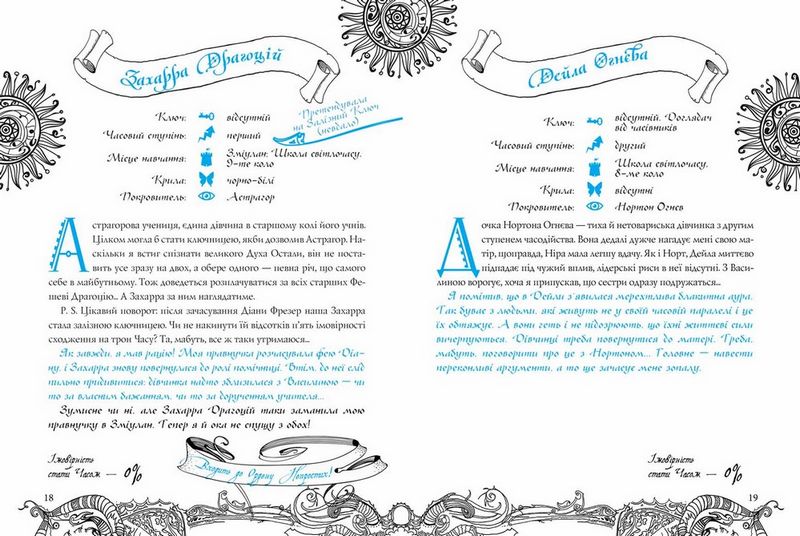 Ця книга є справжнім скарбом для всіх шанувальників циклу «Часодії». У ній зібрано безцінні відомості про ключників і часодіїв, про Ефлару з її розкішними замками та неймовірними істотами, оповідки про таємничі події, які згодом вплинули на весь часодійний світ. А найголовніше — авторка поведе шанувальників часодійної історії у сиву давнину, до самісіньких витоків часодійства — того легендарного дня, коли Час став безцінним!