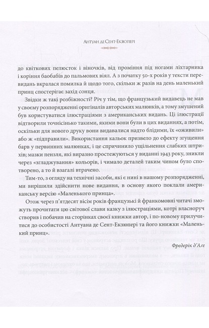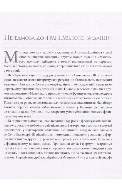 Ця книжка — справжній шедевр видатного французького письменника, поета й мислителя, пілота і вченого, конструктора й винахідника, людини-легенди Антуана де Сент-Екзюпері (1900–1944), якого один із його вчителів назвав «воістину універсальним талантом». Це захоплива лірична казка з цікавою фабулою для дітей і глибинним філософським змістом для дорослих, бо йдеться в ній про вічні категорії — добро і милосердя, чистоту і безпосередність, зачарований погляд на світ і любов до ближ-нього. «Добре бачить лише серце. Найголовнішого не побачити очима», — стверджує письменник цю істину своїм останнім закінченим твором, що його він сам просто і вишукано ілюстрував. Чудова книжка — на всі часи.