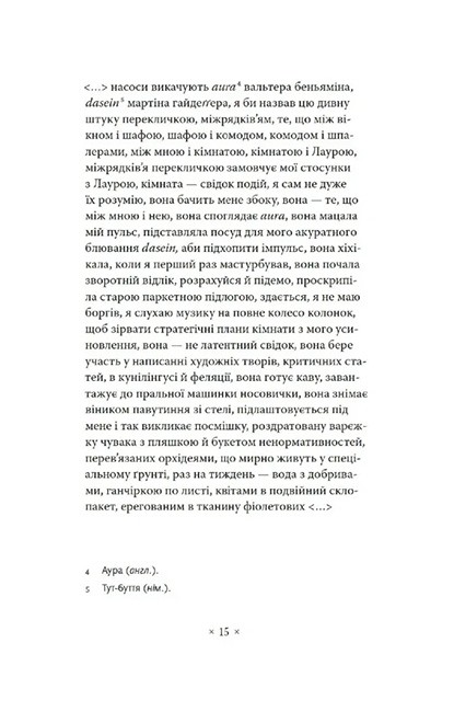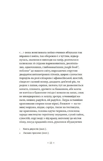 Перед вами — смілива сучасна проза, що сподобається поціновувачам експериментальної літератури, любителям інтимної та чуттєвої образності, а також тим, хто шукає книги з багатою мовною пластикою. Це читання для тих, хто не боїться зустрітися з текстом, здатним збити подих.