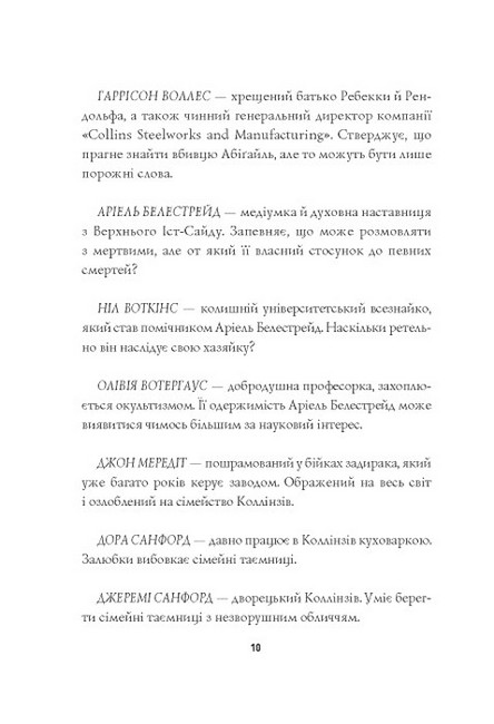Відсутність підозрюваних та доказів, загадкові послання від покійників — і ніби цього замало, все ускладнює ще й закоханість Вілл, через яку вона може стати наступною жертвою. Роман є першим українським перекладом із майбутнього циклу книжок про розслідування, які ведуть Пентекост і Паркер.