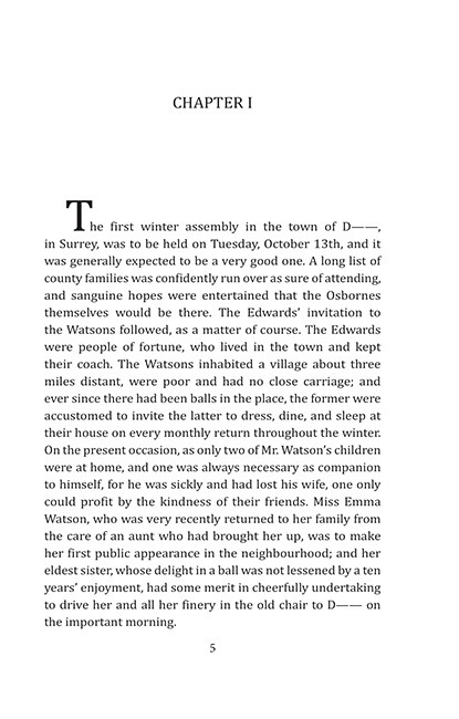 Містер Вотсон — овдовілий священник, у якого двоє синів і чотири дочки. Молодша донька Емма, героїня повісті, виховувалась у заможної тітки і отримала кращу освіту, ніж сестри. Після того, як тітка вийшла заміж, Емма була змушена повернутися в дім батька. Вона вражена нерозсудливим полюванням на чоловіків її старших сестер, Пенелопи та Маргарет. Емма знайомиться з сусідами Вотсонів — лордом Осборном і містером Говардом.