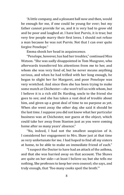 Мистер Вотсон — овдовевший священник, у которого двое сыновей и четыре дочери. Младшая дочь, Эмма, героиня повести, воспитывалась у состоятельной тётки и получила лучшее образование, чем сёстры. После того как тётка вышла замуж, Эмма была вынуждена вернуться в дом отца. Она поражена легкомысленной охотой за мужьями её старших сестёр, Пенелопы и Маргарет. Эмма знакомится с соседями Вотсонов — лордом Осборном и мистером Ховардом.