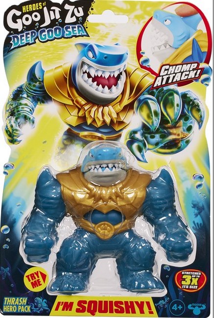 Герої Goo Jit Zu занурились у глибини Deep Goo Sea! Всі бойові прийоми персонажів Goo Jit Zu виведені на новий рівень завдяки новим та унікальним функціям атаки: водяного вибуху, удару головою, чемп-атаки та ін. Кожна з фігурок має різне наповнення, деякі з них вміщують морських істот, які плавають всередині, що робить їх тіла, руки та ноги м'якими, хрусткими та еластичними! Діти можуть розтягнути ці фігурки у три рази, а потім спостерігати, як вони повертається до своєї початкової форми!