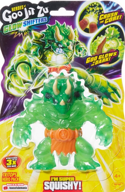 Випробуй суперсилу Гуджитсу! Розтягуй монстра-супергероя, він дуже м'який та супертягучий. Володіючи неймовірною суперсилою, він легко набуває свого первісного вигляду. Фігурка, що тягнеться, приємна на дотик, розтягується в 5-6 разів, скручується і потім легко набуває свого вихідного вигляду. Іграшка-тягучка GooJitZu Герої Гуджитсу Глоу Шіфтерс, Трицераптор має унікальний липкий наповнювач. Іграшка-розтяжка серії "Глоу Шіфтерс" зроблена з еластичного, але міцного полімеру. Безпечна для дітей. Іграшка-антистрес заспокоює, знімає напругу. Вона розвиває уяву, дрібну моторику, координацію.