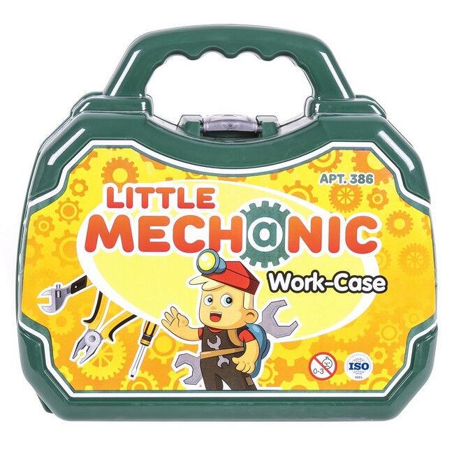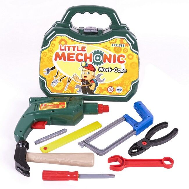 Дитячий набір механіка у валізі може задовольнити запити будь-якого хлопчика дошкільного віку, оскільки в ньому стільки багато цікавих і корисних інструментів. Тут є іграшкова електродриль, пасатижі, ключ, викрутка, молоток, лінійка і навіть ножівка по металу. Таким набором можна не тільки грати, але і допомагати татові по домашнім справам. Прибити цвях або відрізати дощечку – татів помічник готовий до будь-якої роботи і швидко впорається з поставленим завданням.