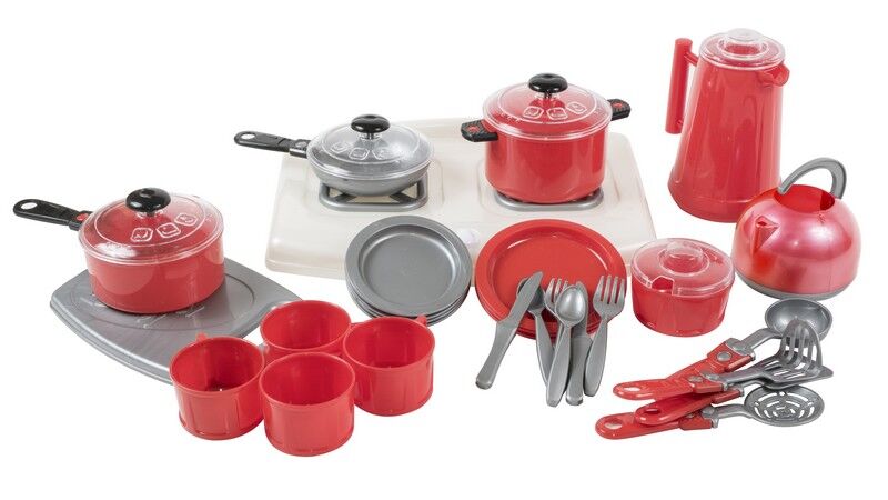 Набір виготовлений із безпечних матеріалів, не містить токсичних речовин і шкідливих домішок. До складу набору входять: Каструля мала - 1 шт., Сковорода - 1 шт., Сотейник - 1 шт., Цукорниця - 1 шт., Дошка обробна - 1 шт., Кришка цукорниці - 1 шт., Кавник - 1 шт., Кришка кавника - 1 шт ., Кришка каструлі - 2 шт., Тарілка велика - 4 шт., Плита - 1 шт., Ложка - 4 шт., Веделка - 4 шт., Чашка - 4 шт., Ніж - 4 шт., Тарілка мала - 4 шт., Лопатка - 1 шт., Шумівка - 1 шт., Картофелемялка - 1 шт., Ополоник - 1 шт.