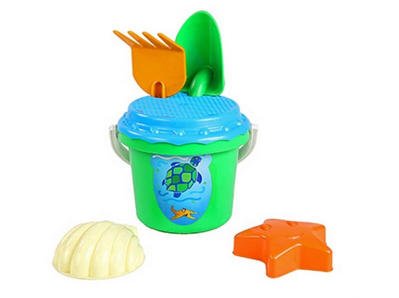 До складу пісочного набору №5 входять: відерце, кришка-сіто, лопатка і грабельки. А ще набір укомплектований формами для піску – морською зіркою і черепашкою. Якщо батьки хочуть спокійно відпочивати на пляжі, то вони дарують своїм дітям такі набори. Дитина зможе грати в піску цілими годинами, придумуючи нові і цікаві ігри. До складу використаного для виготовлення іграшки пластика не входять шкідливі домішки і компоненти, що викликають алергію або подразнення шкіри.