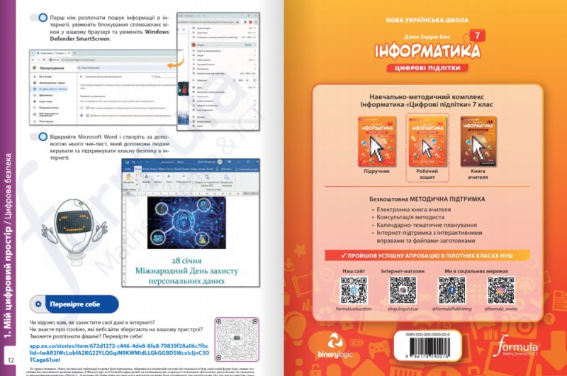 «Інформатика. 7 клас» – це серія навчальних матеріалів з інформатики від міжнародного видавництва «Binary Logic» та українського бренду Formula. В основу курсу покладений інноваційний підхід до подання матеріалу та відпрацьовування навичок комп'ютерними технологіями. Робочий зошит містить цікаві завдання, які максимально наближені до реальних ситуацій, з якими ми зустрічаємося, працюючи з комп'ютерними технологіями.