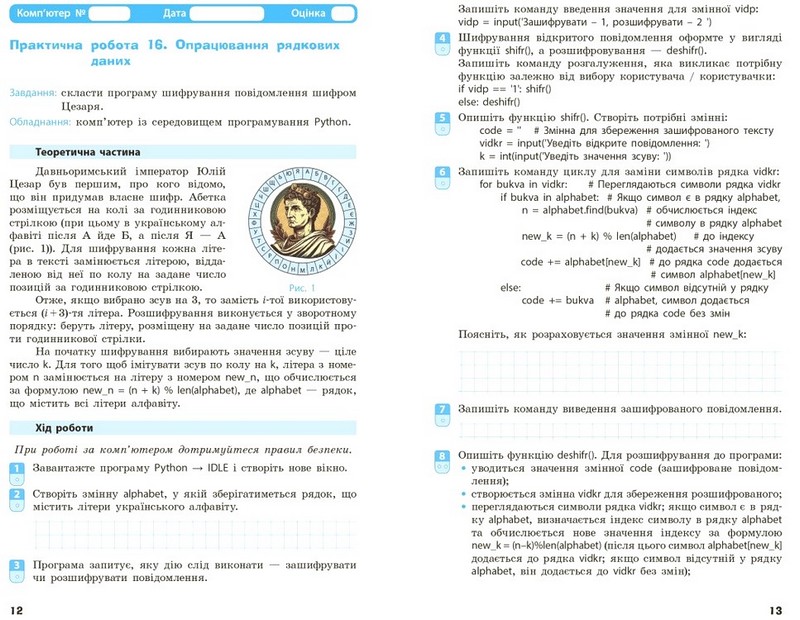 Посібник містить теоретичний матеріал, вправи для самостійного і групового виконання, практичні роботи з покроковим описом, приклади з різних галузей людської діяльності, цікаві факти тощо. До посібника пропонується електронний інтерактивний додаток, який містить довідкові матеріали, додаткові матеріали до вправ і практичних робіт, тести з автоматичною перевіркою відповідей та ін. Призначено для учнів і учениць 7 класу закладів загальної середньої освіти, учителів інформатики.