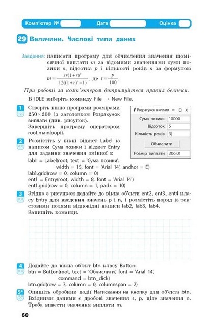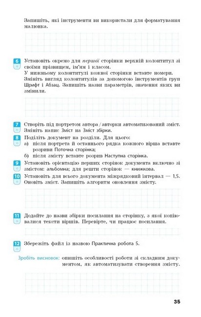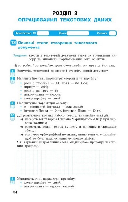 Робочий зошит містить теоретичний матеріал, вправи для самостійної і?групової роботи, практичні роботи з покроковим описом виконання, творчі завдання, логічні задачі, кросворди тощо.Інтерактивний електронний додаток містить методичні рекомендації щодо користування посібником, правила поведінки та безпеки в комп’ютерному класі, файли-заготовки до вправ і?практичних робіт (у?тексті мають позначку «*»), практикум з використання інформаційних технологій, тести з?автоматичною перевіркою відповідей (за QR-кодом або посиланням).