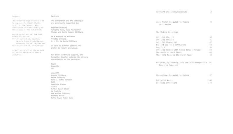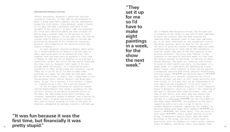 У цьому каталозі представлено вісім картин Жан-Мішеля Баскії, написаних влітку 1982 року, коли він приїхав до Модени, Італія, на одну зі своїх перших персональних виставок у Європі в галереї Еміліо Маццолі. За кілька днів Баскія намалював групу великоформатних полотен, які перевершили його попередні роботи як за масштабом, так і за технікою виконання. Кожна розміром 6,5 на 13 футів, ці роботи знаменують перехід Баскія від створення графіті на вулицях Мангеттена до живопису на полотні. Концепція та привід для виставки зрештою виявилися ризикованими, і замість того, щоб піддатися тиску та очікуванням, Баскія скасував виставку. Картини, включно з шедеврами, які сьогодні вважаються ключовими та одними з найвидатніших у його творчості, ніколи не виставлялися разом. Цей каталог повертається до цього вирішального моменту кар'єри Баскії і вперше об'єднує їх разом.