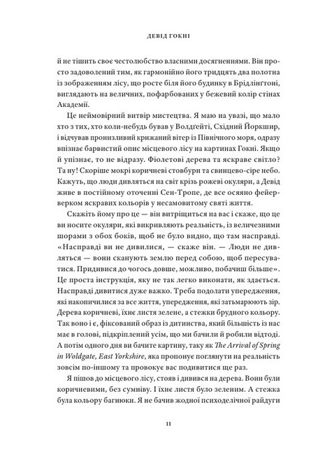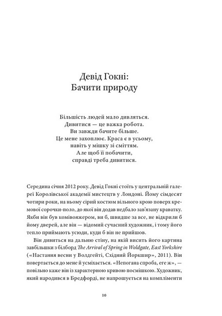 «…Ми більшу частину часу живемо в напівпритомному стані, переходячи від однієї рутинної події до іншої з пригніченими почуттями, наче зомбі у світі неживих. Ми не бачимо красивої ріні на пляжі, тому що, як ті дурненькі рибки, ми часто не помічаємо, що нас оточує. Але так не повинно бути; це не повинно бути нашою частковою реальністю. Ми можемо навчитися дивитися й відчувати світ з підвищеною свідомістю художника: відчувати насолоду від того, що бачимо світ справжнім, стовідсотковим зором… Дерево, будівля, забарвлення дороги — все це стає непомітним, не відкладається в нашій свідомості. Ми пропускаємо так багато! А художники — ні. Вони бачать “невинним оком”, як казав Джон Раскін, критик вікторіанського мистецтва. Вони вчаться відвикати: бачити так, ніби вперше, а не всоте».