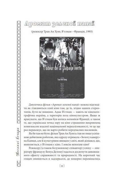 Ця книга, популярний путівник світом кіно, пропонує короткі тексти, написані в оригінальному жанрі, що поєднує літературну есеїстику, філософські роздуми та кіноаналіз. Автор розповідає про фільми майже двохсот режисерів різних континентів і періодів історії кіно. В Україні така спроба робиться вперше і буде цікава тим, хто хоче краще зрозуміти світ кіно.
