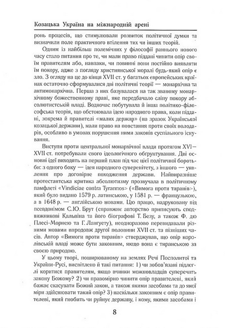 У пропонованій науково-популярній книзі відомого сучасного історика розкрито складні проблеми входження Української козацької держави до системи міжнародних відносин протягом XVII–XVIII століть. На основі оригінальних історичних джерел автор досліджує зовнішні контакти гетьманських урядів України, починаючи від Богдана Хмельницького й завершуючи Пилипом Орликом, з тогочасними державами — Австрією, Італією, Молдавією, Московією, Німеччиною, Польщею, Волощиною (тепер Румунія), Туреччиною, Швецією, Францією та іншими країнами Європи й Азії.